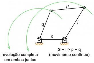 No mecanismo a barra mais curta 's' é uma barra fixa (barra de aterramento). A barra 'p' é a mais comprida. As barras q e l estão fixadas na barra 's' e podem executar uma volta completa (360°). Para tanto, há uma regra geral e simples de aplicar que permite verificar se o órgão motor pode rodar continuamente em torno do eixo de rotação, ou se apenas pode oscilar numa determinada amplitude.