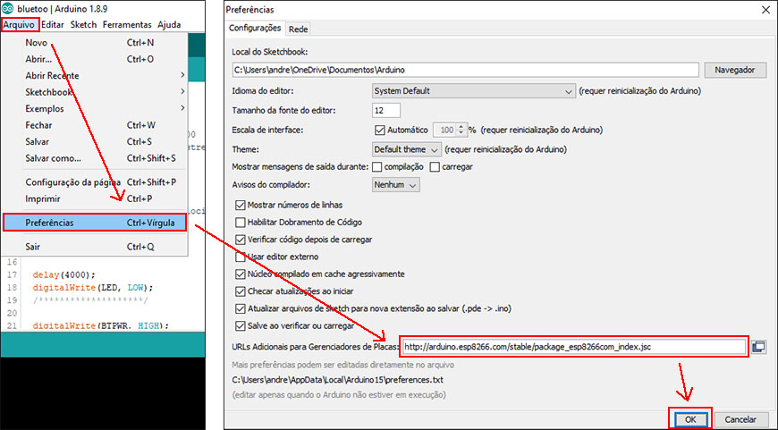 Na Arduino IDE altere as preferências do sistema adicionando a URL "http://arduino.esp8266.com/stable/package_esp8266com_index.json" aos Gerenciadores de Placas da IDE. Após, é necessário instalar a placa através do Gerenciador de Placas (Menu » Ferramenta » Placa ... » Gerenciador de Placas). Procure na lista o título "esp8266 by ESP8266 Community" e instale.