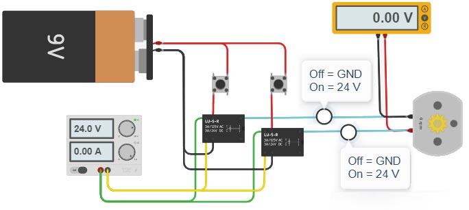 5.7. Controlando sentido do motor com ReléProjeto inverte giro de motor com chave táctil e reléNo circuíto abaixo, duas chaves tácteis são utilizadas para mudar o sentido do giro de um motor de corrente contínua (CC ou DC). Ao clicar-se em cada chave em separado, os módulos relés são acionados para controlar a inversão do sentido da corrente do motor. Os módulos relé também alimentam o motor com 24 V de corrente.