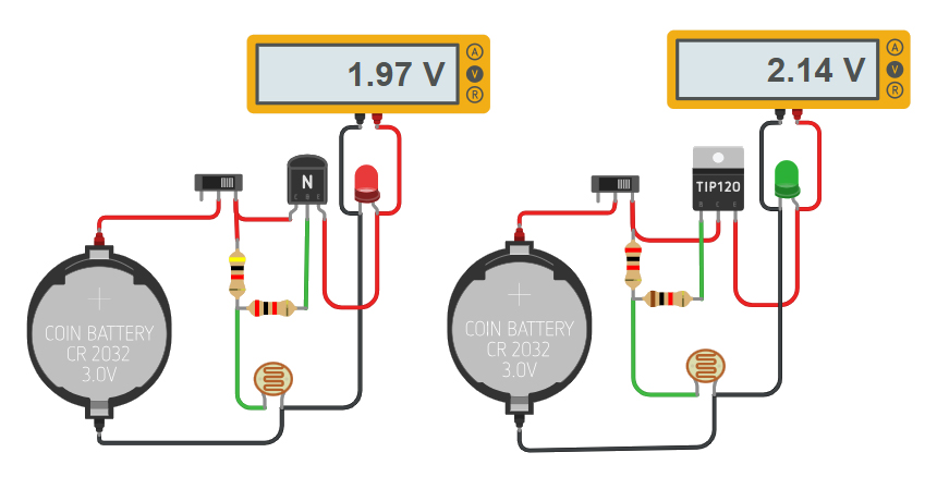 7.5. Acende LED quando escurece (sensor LDR)O circuíto utiliza 1 bateria de lítio de 3V, resistores, 1 fotoresistor 3 mm LDR (Light Dependent Resistor), 1 mini ou micro Led Verde, Transistor e Chave deslizante on/off . O sensor LDR é o principal componente do circuito e é utilizado para medir o nível de luz do ambiente. Quando o ambiente fica escuro, o Led acende. Ele funciona como um resistor variável que muda sua resistência de acordo com a quantidade de luz que recebe: quanto mais luz, menor a resistência, e quanto menos luz, maior a resistência Na versão da esquerda o sensor LDR está ligado a base do Transistor NPN 2N2222 (BJT) e ao divisor de tensão. Na versão da direita o Transistor utilizado é o NPN TIP120. Um divisor de tensão é um circuito elétrico usado para reduzir uma tensão de entrada mais alta para um valor menor. Basicamente, ele divide a tensão de entrada por um fator específico para obter a tensão desejada. Esse tipo de circuito é especialmente útil quando precisamos adaptar uma tensão para ser compatível com um componente, como um microcontrolador, que só opera com tensões mais baixas. O divisor de tensão é formado por dois resistores. O primeiro é o potenciômetro de 4 K, mais a resistência de 2K de proteção. Como a luz incide sobre a superfície do LDR, ele muda sua resistência. Quanto mais luz, menor será a resistência e menor a queda de tensão. Quanto menos luz, maior será a resistência e maior a queda de tensão através dela. Como a queda de tensão aumenta, o mesmo acontece com o Transístor NPN 2N2222, até o momento em que a tensão é suficiente para acionar o Led.