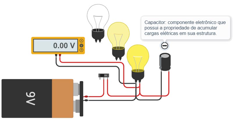 8.5. Emprego de um capacitorCapacitor para armazenamento de energiaO projeto utiliza um capacitor que armazena energia para alimentar uma lâmpada enquanto um interruptor estiver ligado. Quando o interruptor é desligado, o capacitor aos poucos vai liberando a energia armazenda e a luminosidade da lâmpada vai esmaecendo.