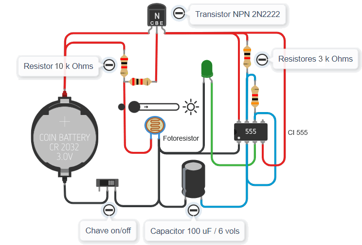 O circuíto abaixo utiliza 1 bateria de lítio de 3V, 1 Capacitor polarizado de 100 uF/4 Volts, 1 resistor de 1 kΩ, 2 resistores de 3kΩ, 1 resistor de 100 kΩ, 1 fotoresistor 3 mm LDR (Light Dependent Resistor), 1 mini ou micro Led Verde, 1