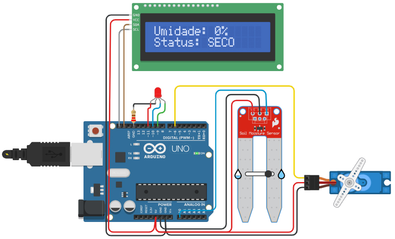 4.5. Regador de plantaO projeto consiste em um sistema automatizado de monitoramento de umidade do solo que combina leitura de dados, exibição visual e resposta mecânica. O sensor de umidade mede o nível de água presente no solo e envia os dados para o arduino uno, que processa a informação e exibe no display LCD I2C (16x2) o valor percentual e o estado atual — seco ou molhado. Para facilitar a visualização, um LED RGB indica a condição do solo por meio das cores vermelho e verde, enquanto um servo motor é acionado quando o solo está seco, realizando um giro de 60 graus como resposta física de alerta ou controle para liberação de água.