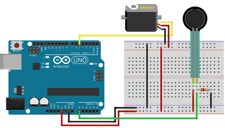 O projeto usa Micro Servo motor SG90, placa Arduino Uno R, potenciômetro e jumpers para controlar uma garra.