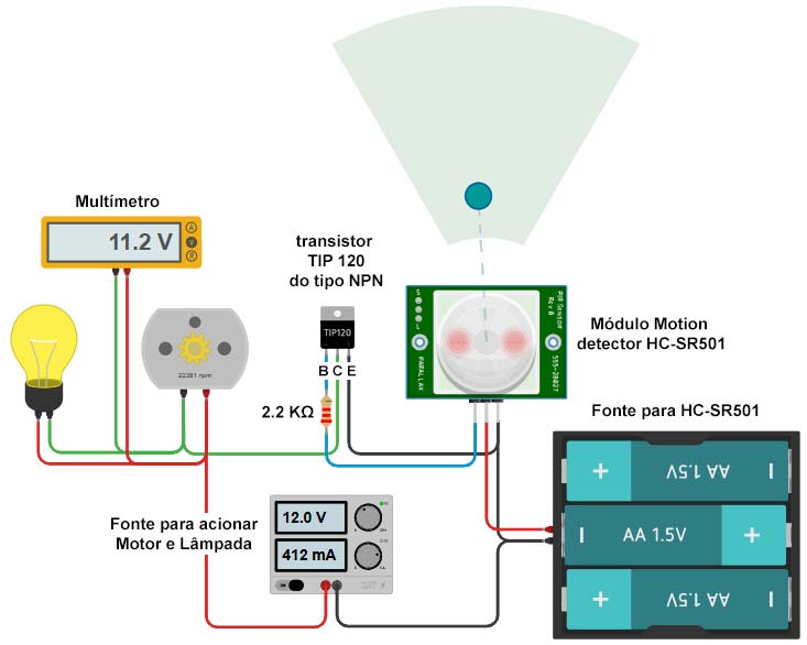 O projeto usa o Módulo Motion detector HC-SR501 e transistor TIP 120 para acionar uma lâmpada incandescente e um motor de Corrente Alternada (CA) sem o uso do arduino. No circuíto, o transistor NPN TIP120 controla o motor de CA que necessita de mais corrente do que os pinos do arduino podem fornecer. O transistor funciona como uma chave que liga ou desliga a corrente gerada por uma fonte de energia de 12 Volts.