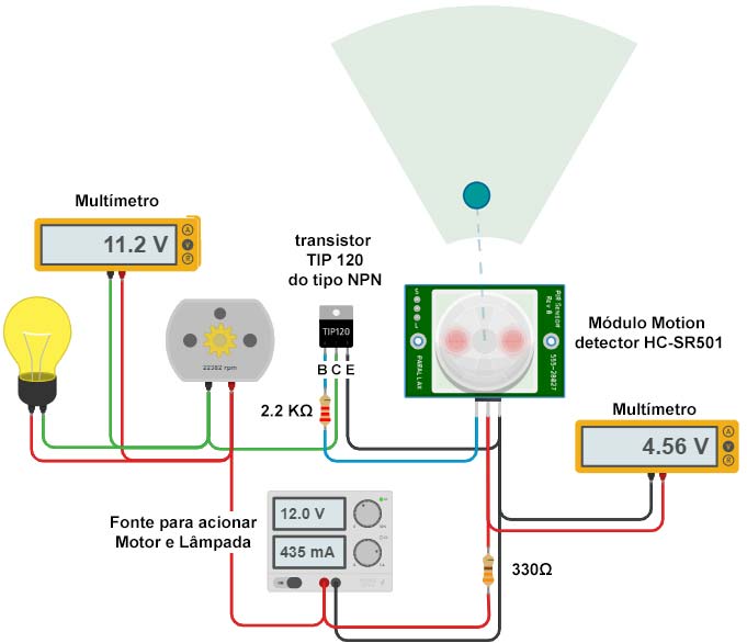 O circuito trabalha com duas fontes de energia. A primeira de 12 Volts para alimentar a lâmpada e o motor, a segunda de 5 Volts para alimentar o Módulo Motion detector HC-SR501. A tensão máxima aceita pelo TIP120 na base é de 5 Volts. Nesta versão utilizamos um resistor de 2.2 KΩ para alimentar a base com 1,45 Volts.