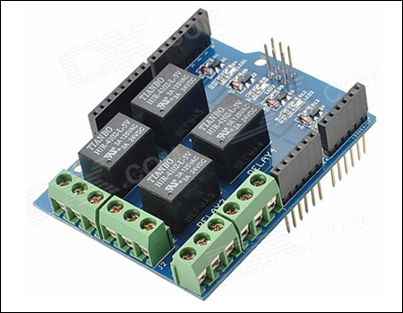 Por exemplo, o "Relé Shield 5V 4 Canais" visa projetos voltados para automação residencial. Este shield é encaixado diretamente na placa Arduino, reduzindo o número de conexões no seu circuito. É compatível com Arduino Uno e outras placas com estrutura semelhante. A conexão para os relés é feita por meio de conectores com parafusos, permitindo o controle do acionamento de até 4 dispositivos eletrônicos pela internet, tais como uma lâmpada, tomada, televisão, etc..