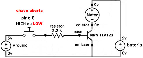 No circuito, o pino digital 8 do arduino está conectado a base (B) do transistor. Através dele controlamos o fluxo de corrente do coletor para o emissor, permitindo que se ligue ou desligue o motor. O negativo do motor (GND) está conectado ao emissor (E) e o positivo ao polo positivo da bateria externa. O negativo da bateria (GND) está conectado ao coletor do transistor (C).