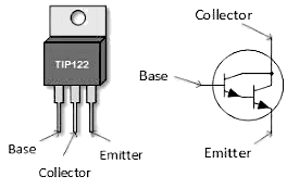 Neste experimento, utilizaremos o transistor TIP 120 ou TIP 122 do tipo NPN. Ele possui a capacidade de pegar um sinal muito fraco na entrada (base) e transformá-lo-o em um sinal potente na saída (coletor ou emissor). É indicado para uso em média potência para acionamentos de cargas até 5A. Ele possui três terminais que se chamam base (B), emissor (E) e coletor (C).